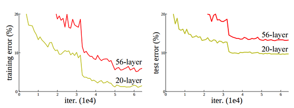 실제로 실험 결과, shallow network에서 학습된 모델위에 다층의 layers를 추가적으로 쌓습니다. 이론적으로는 deeper 모델이 shallower 모델에 추가된 것이기 때문에 더 낮은 training error를 보여야 합니다. 하지만 학습된 shallower 모델에 layers를 더 추가시켜도, 그냥 shallow 모델보다 더 높은 training error를 보여줍니다.