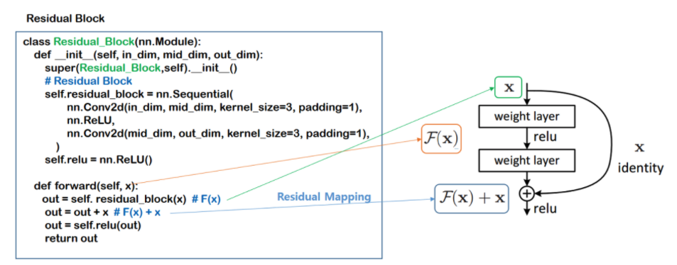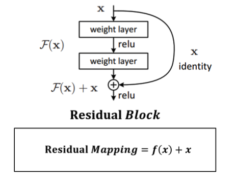 -> 여기서 identity mapping이라는 뜻은 f(x)=xf(x)=x 의 의미입니다. (값을 받으면 동일한 x를 리턴시키는 덧셈 레이어)
